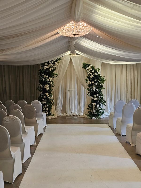 This is an elopement styled ceremony That takes place in our White Oasis Wedding Chapel. This package includes ivory drapes cascading from ceiling to floor, chandelier lighting, seating for up to 120 people, a white aisle, wedding officiant, marriage licensing, and free parking. (Check out our decor packages!)